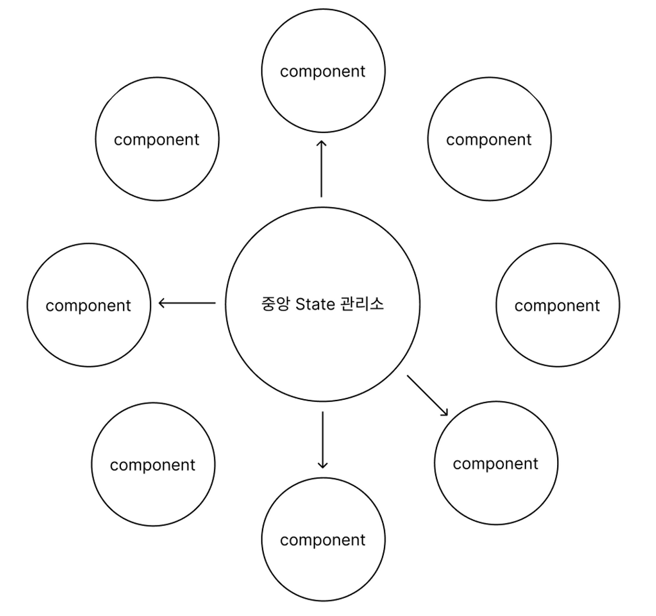 - Global state는 컴포넌트에서 생성되지 않습니다. 중앙화 된 특별한 곳에서 State들이 생성됩니다. 좀 더 쉽게 얘기해서 “중앙 state 관리소” 라고 생각하면 됩니다.