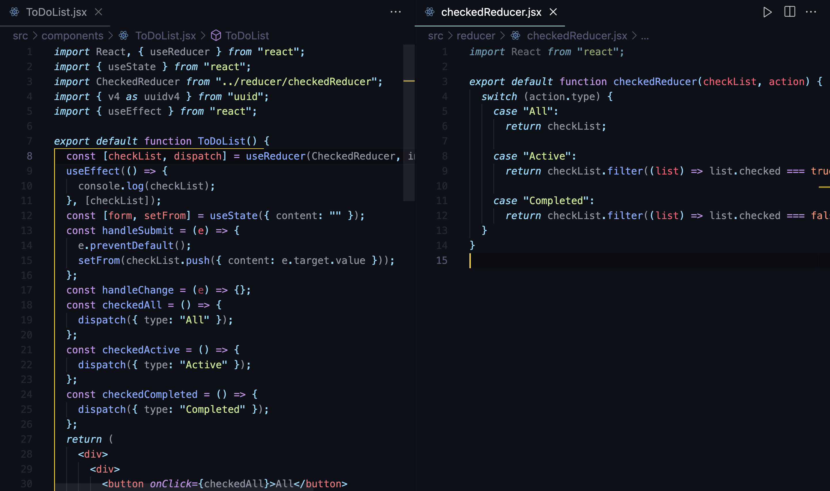 useReducer함수로 투두리스트의 all, active, completed버튼을 구현하려했는데 filter함수를 썻음에도 setState함수처럼