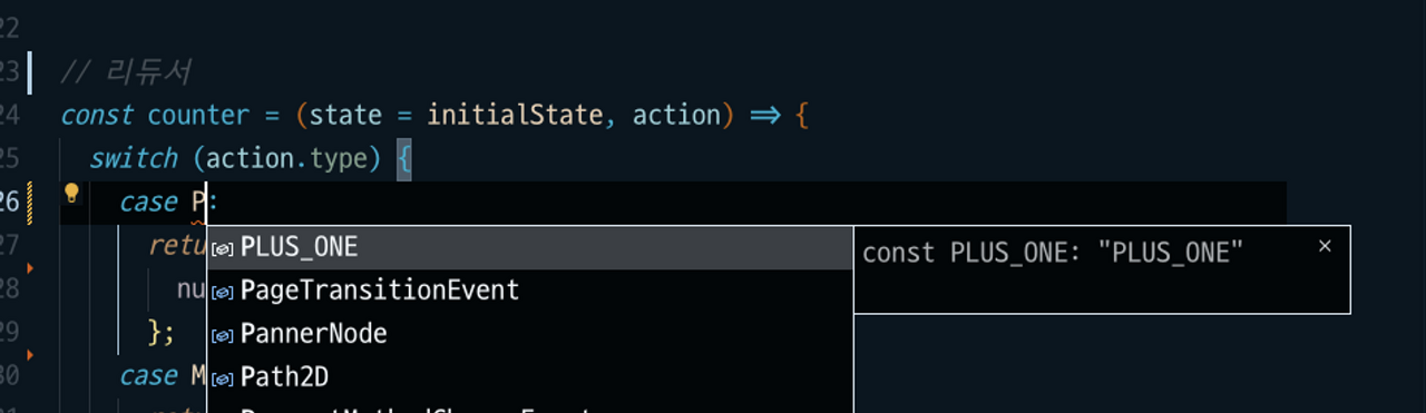 type: PLUS_ONE, // type에는 위에서 만든 상수로 사용 (vscode에서 자동완성 지원)
