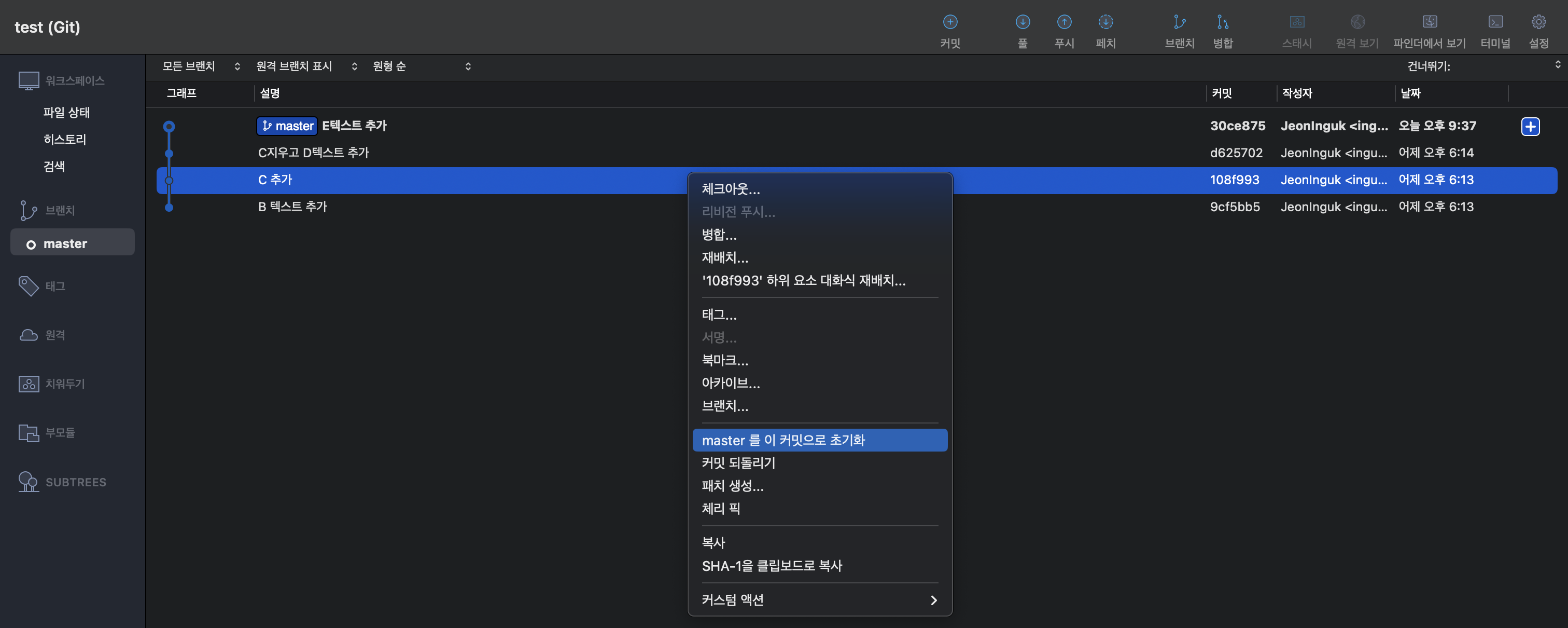 만약 10개의 버전이 존재하고, 그중 reset하고싶은 버전이 4번째에 존재한다면 5번째부터 10번째까지의 버전은 모두 지워지고 4번째버전이 최종버전인채로 남게된다.