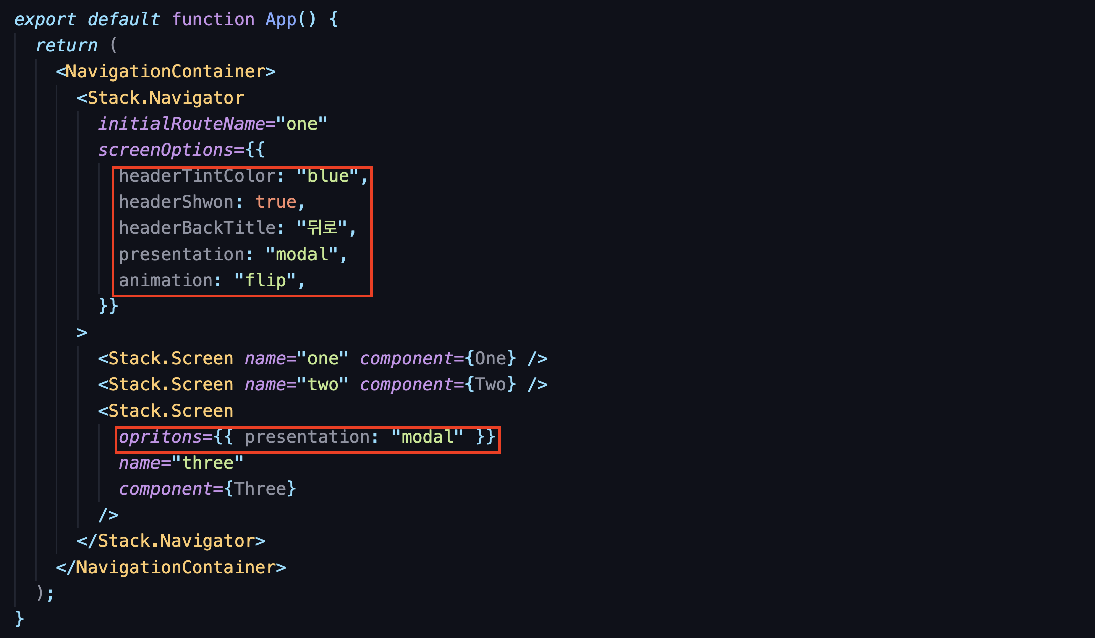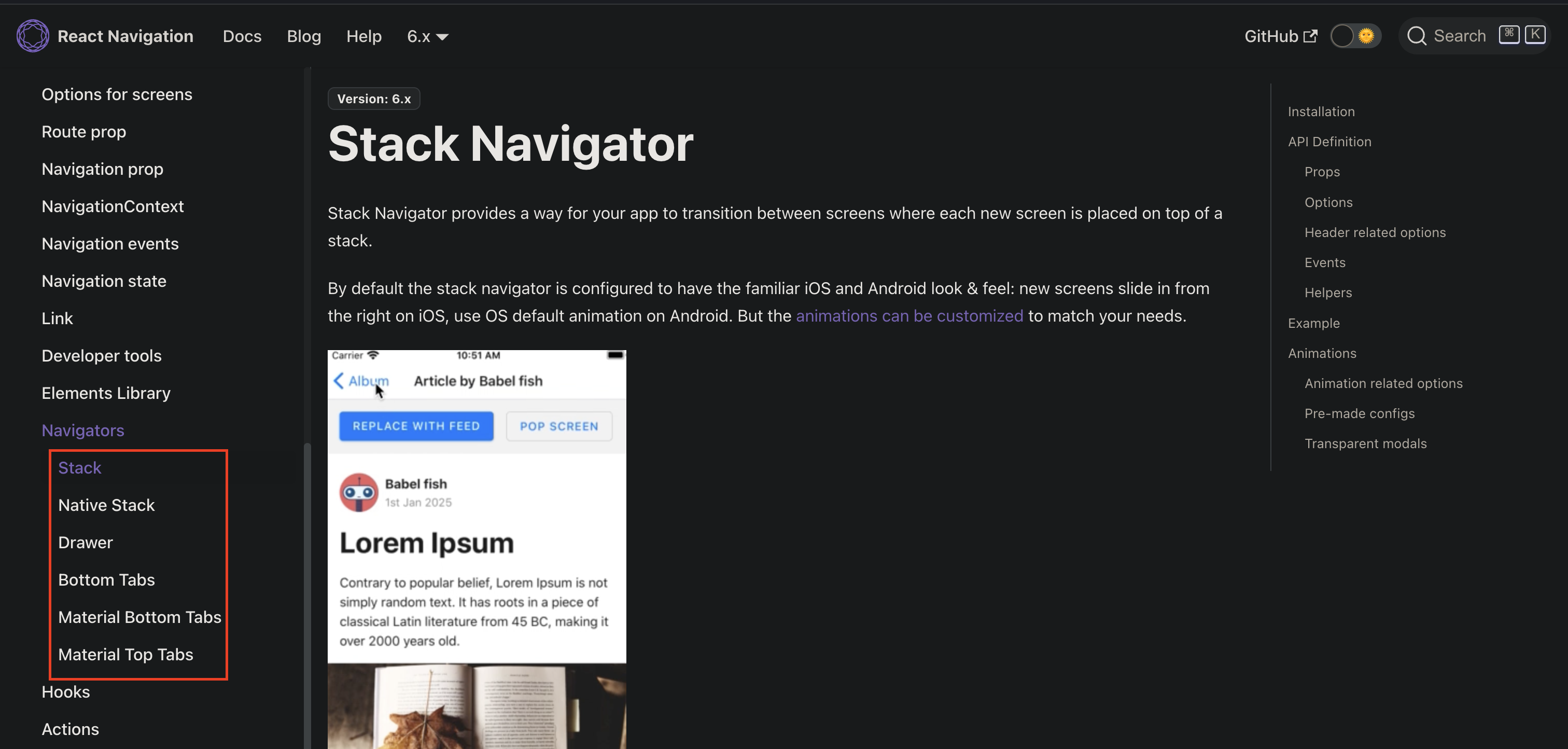 native stack props는 메뉴탭[API Reference-> Navigatiors -> props]에서 확인가능하다.