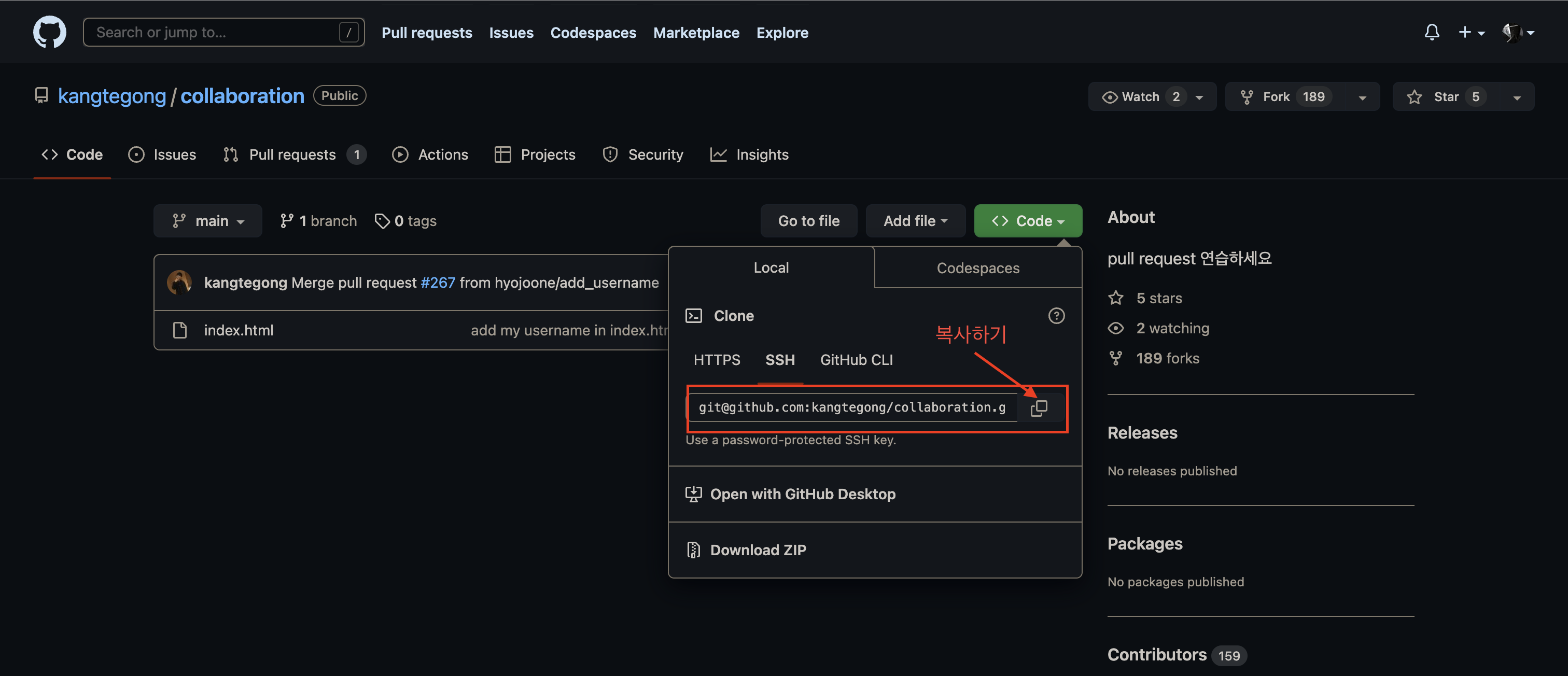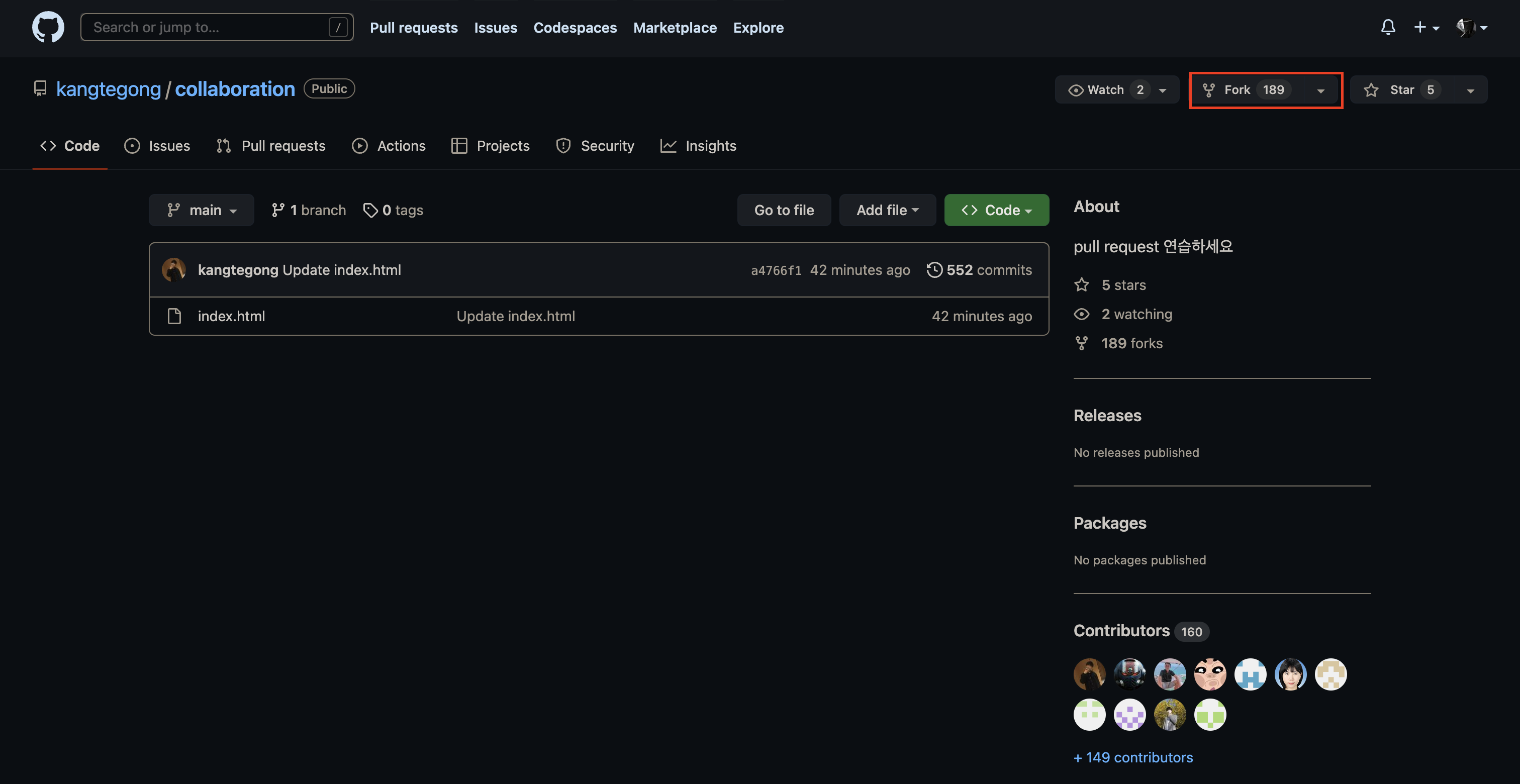 - 레파지토리가 자신의 소유가 아니라면 푸시할 수 없기때문에 일단 포크를 해온 후 작업하는 것이다.