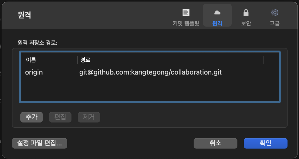 - 설정 -> 원격 탭으로 이동한 후 '추가' 클릭
