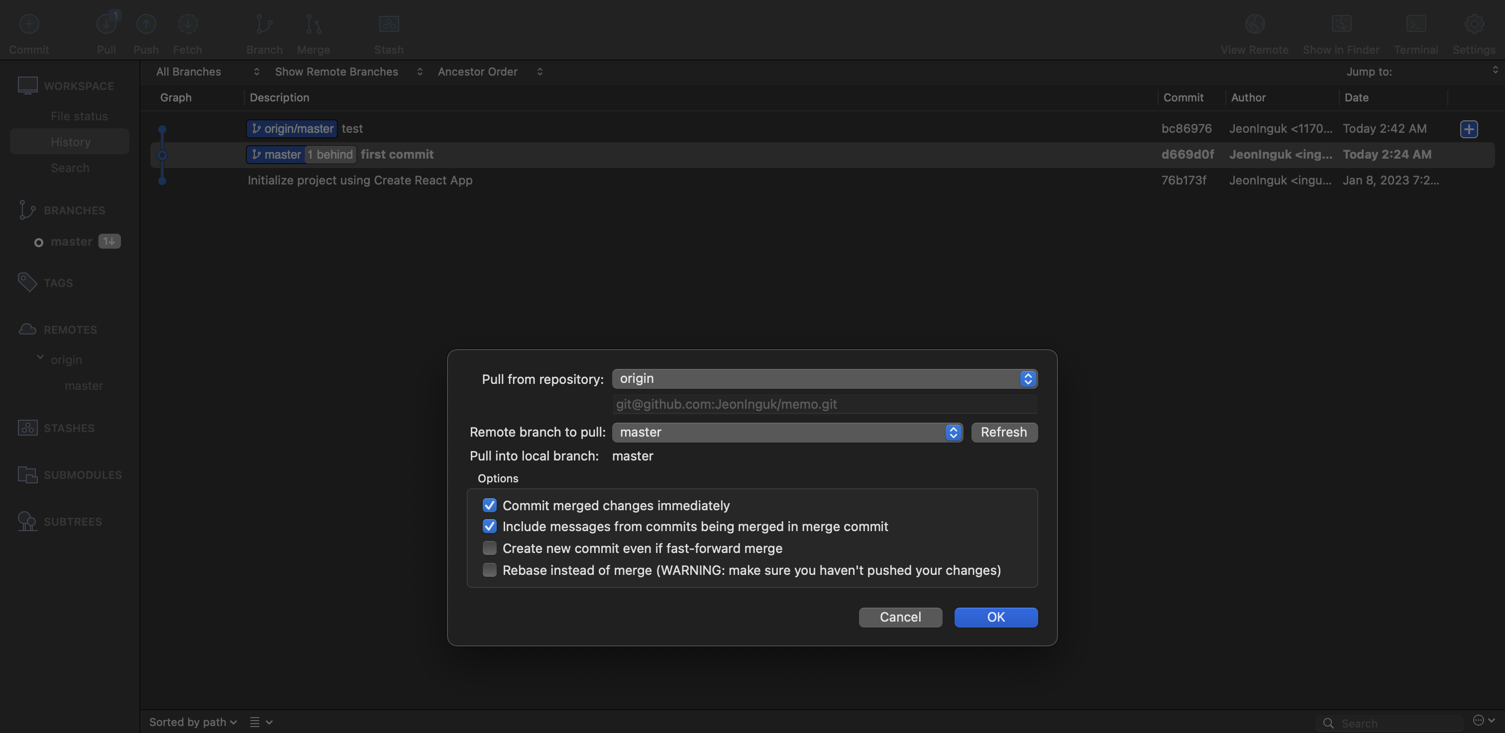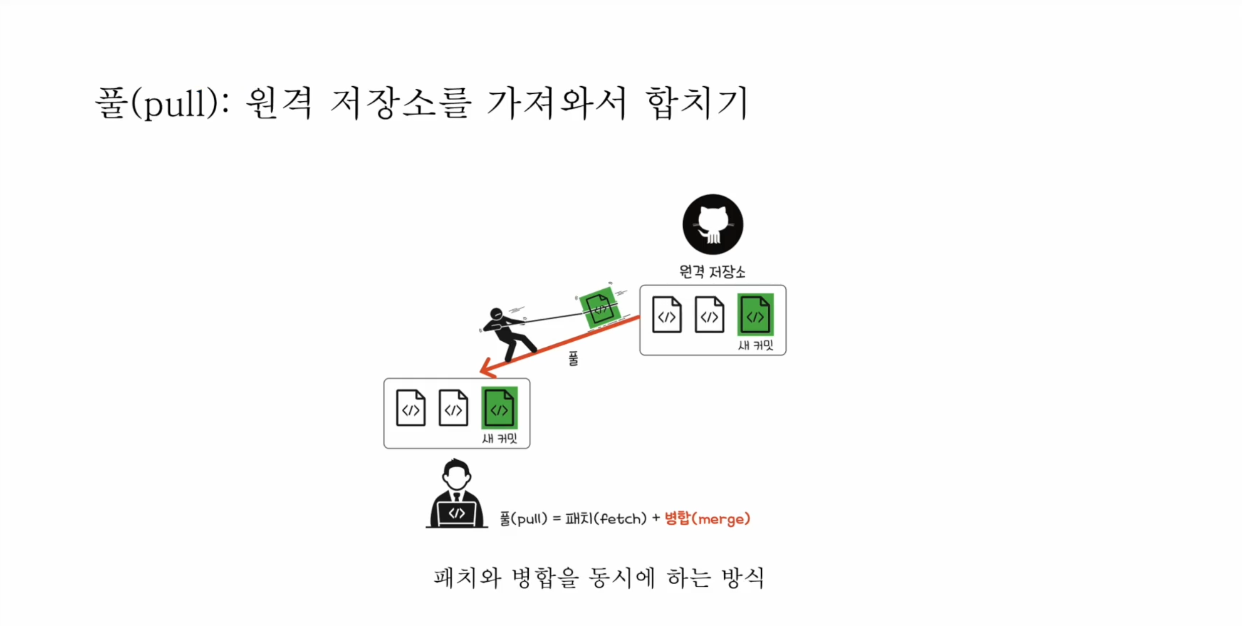 - pull은 fetch와는 다르게 원격저장소의 변경물을 로컬저장소의 작업물과 병합한다.