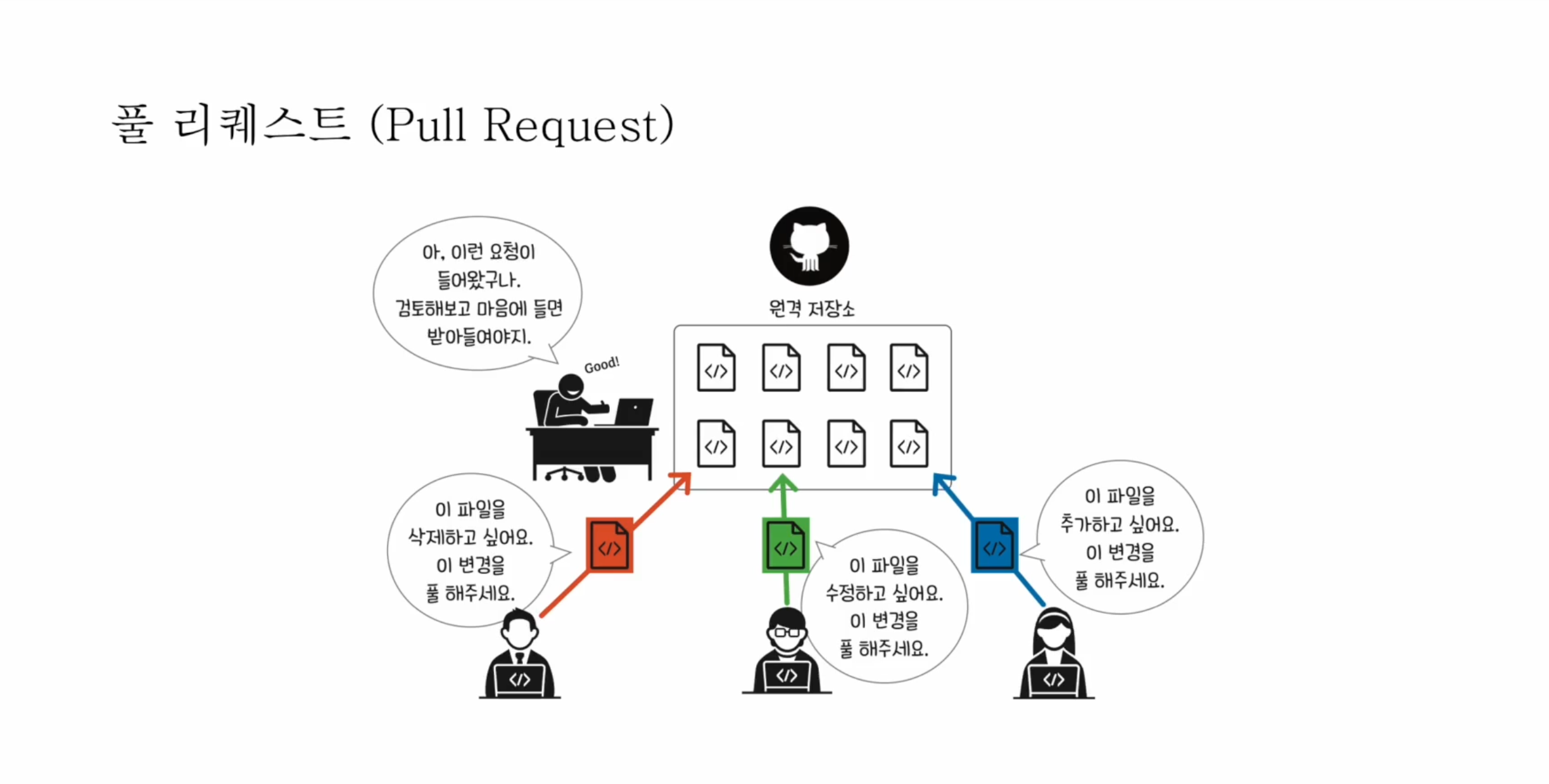그렇다면 어떻게 자신의 작업물을 푸시할 수 있을까? 바로 자신의 변경사항을 푸시해달라고 요청하는 것이다.