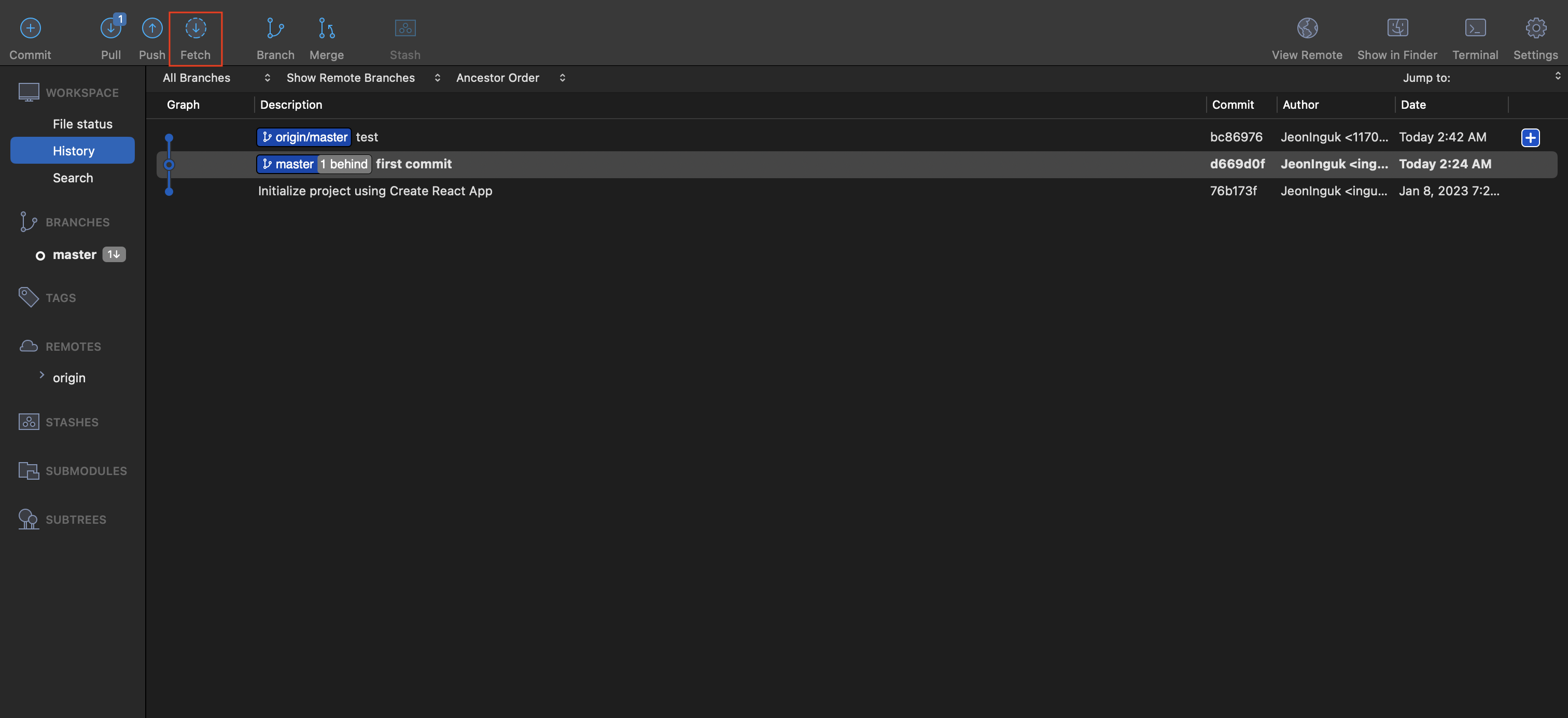 - fetch를 한다면 -> 로컬 저장소의 브랜치에는 영향을 주지는 않으나, 원격 저장소의 브랜치에는 업데이트가 되게 된다.
