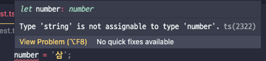 처음에 숫자 (number)를 할당했으니 number에 string를 할당할 수 없다고 에러가 난다.