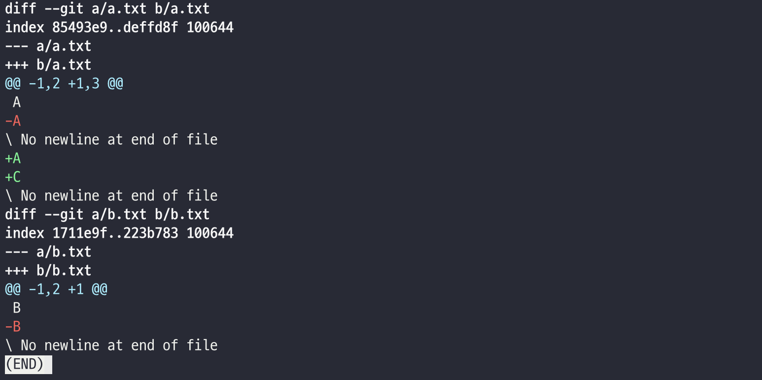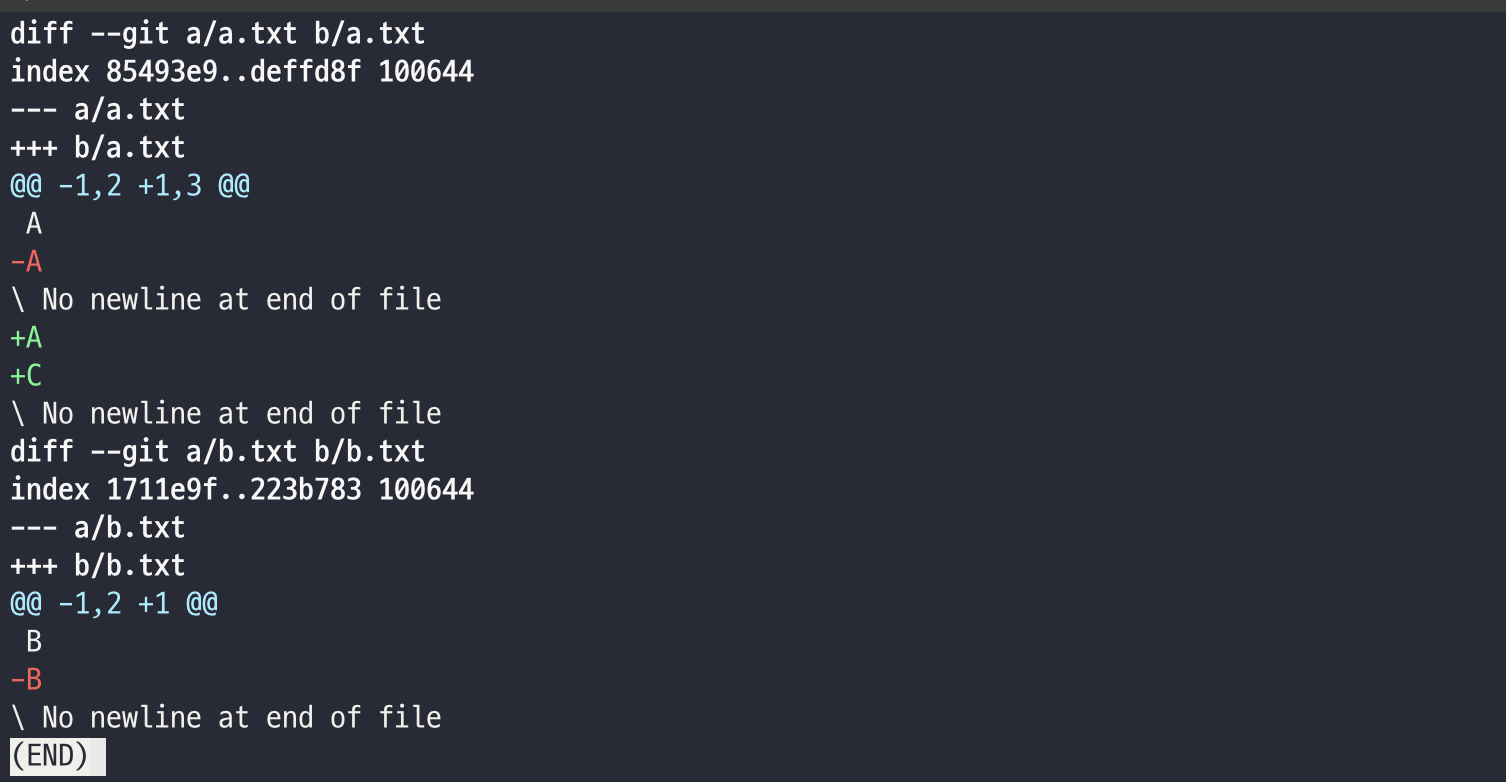 - 최신버전과 최신버전commit이후 아직 commit하지않고, stage에만 올린 변경사항의 변경내용을 비교하는 명령어이다.