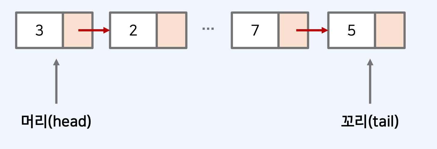 - 연결리스트로 구현할 때는 머리(head)와 꼬리(tail) 두개의 포인터를 가진다.