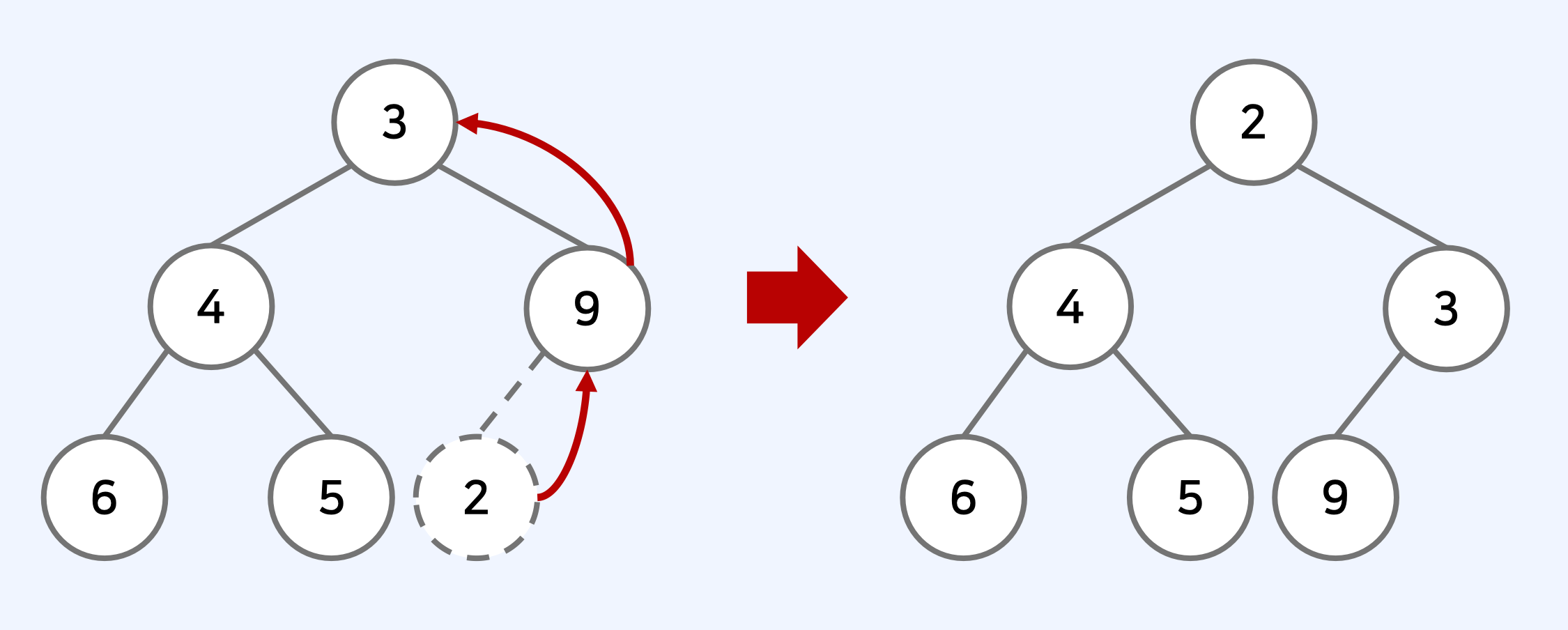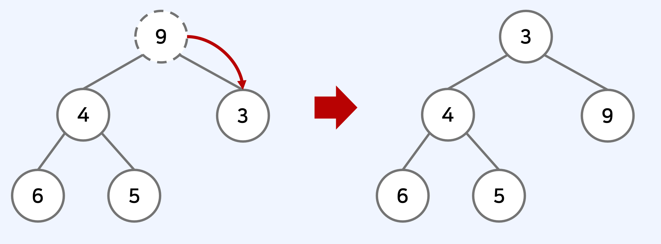 - 원소가 제거되었을 때 𝑂(𝑙𝑜𝑔𝑁)의 시간 복잡도로 힙 성질을 유지하도록 할 수 있다.