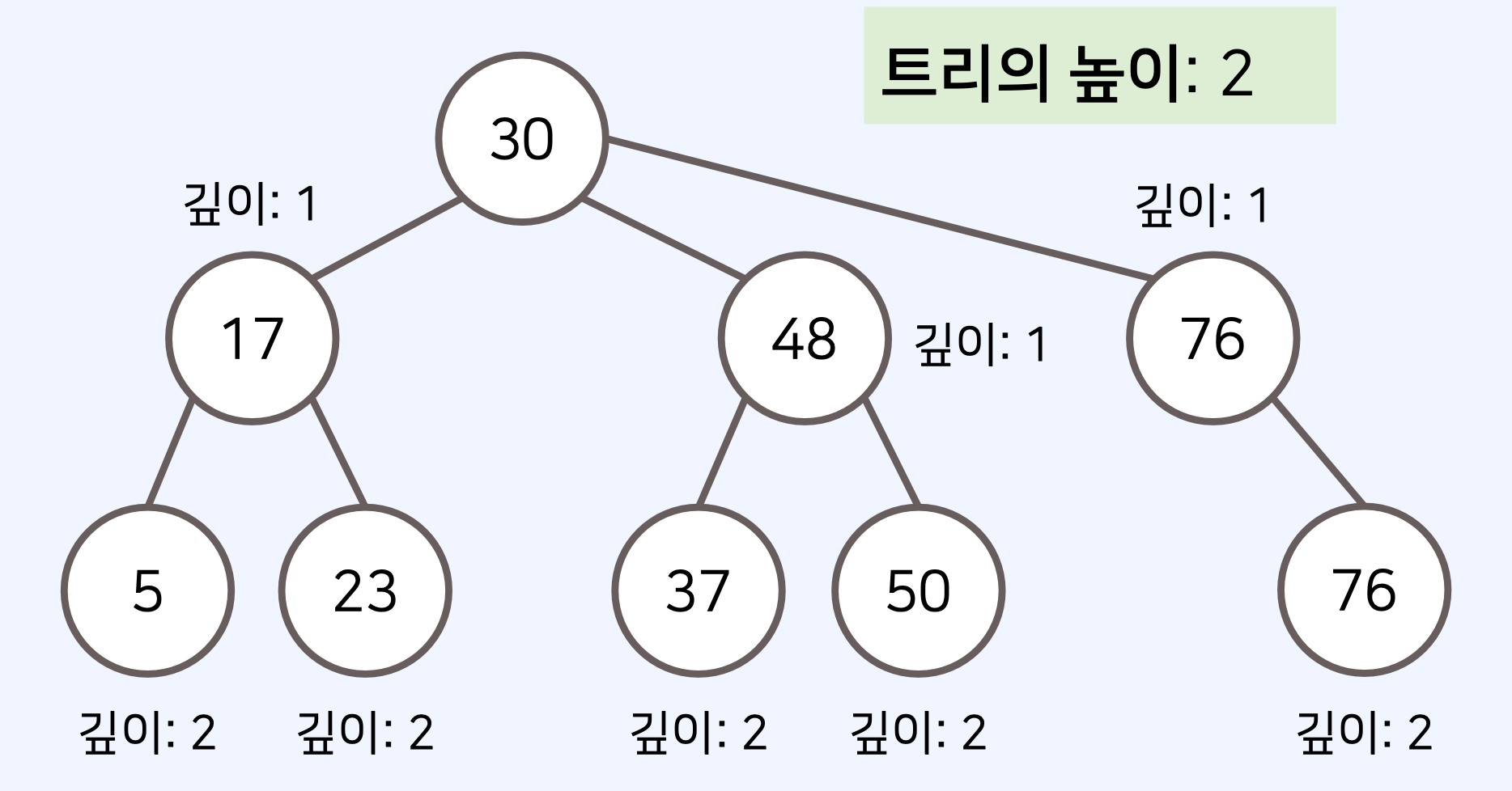 - 깊이(depth): 루트노드에서의 길이(length)