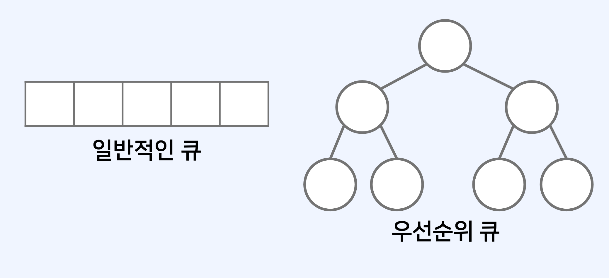 - 반면에 우선순위 큐는 이진트리(Binary tree)구조를 사용하는 것이 일반적이다.
