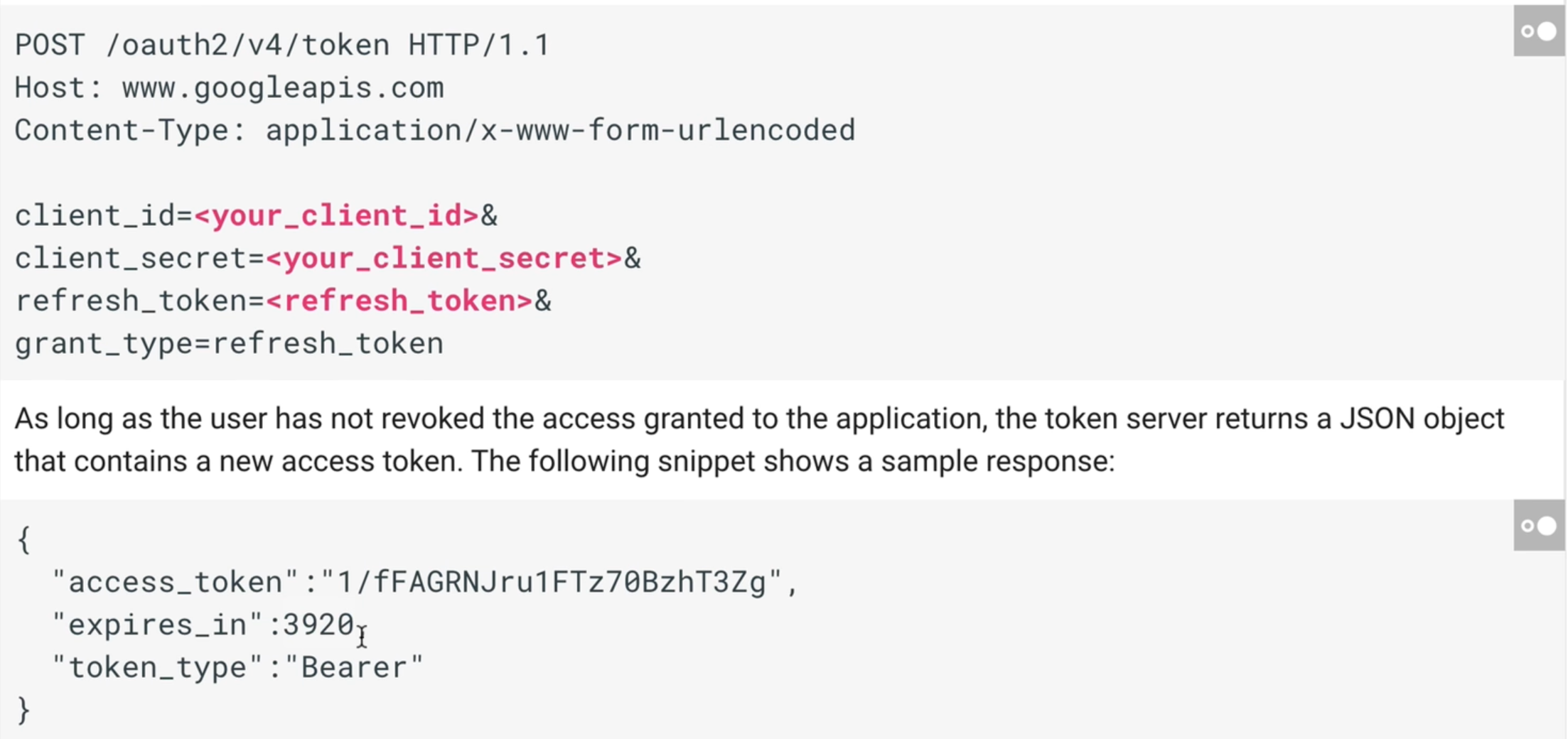 access token은 수명이 존재한다. (짧게는 1~2시간, 길게는 90일까지도) 이렇게 수명이 다한 access token에 대해서는 API호출에 대한 응답값을 받을 수 없다. 이렇게 수명이 다할때마다 Resource Owner에게 인증과정을 다시 거치게 하는 것은 UX적으로 좋지 않기때문에 refresh token을 이용하면 된다.