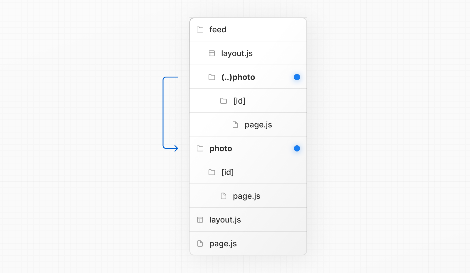 - Intercepting Routes는 (..)컨벤션을 따르면 된다. Next개발팀이 ../에서 영감을 받은 듯 하다.