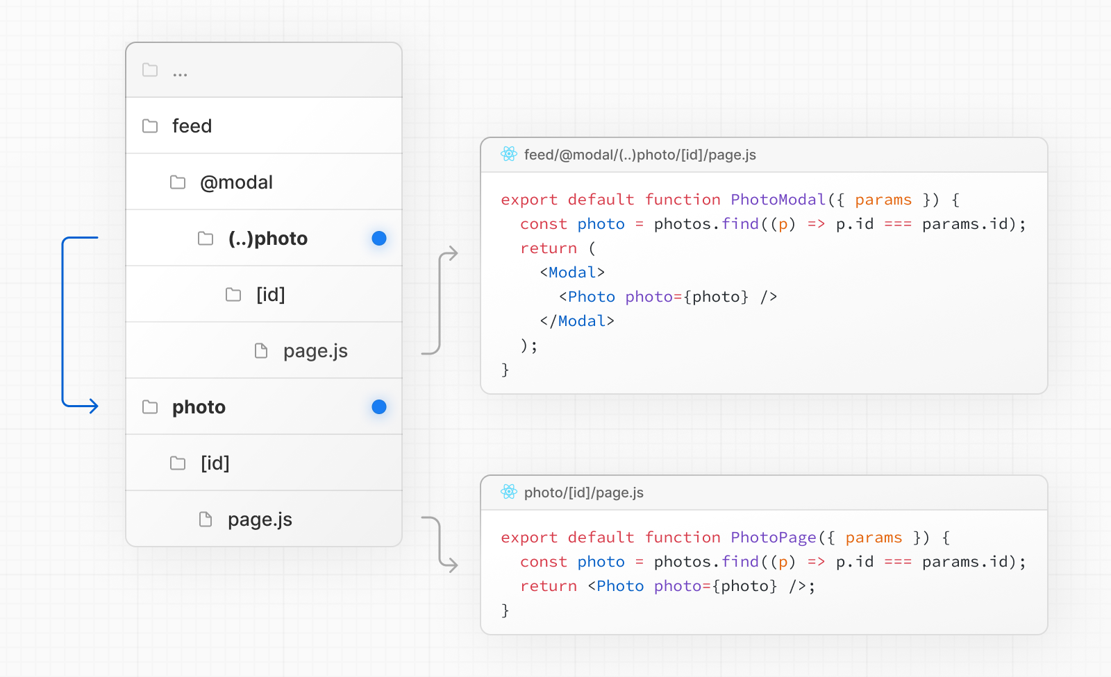 -> 예를 들어 피드 내에서 사진을 클릭하면 피드에 오버레이되는 모달이 사진과 함께 표시되게 하고싶을때 Next.js는 /feed 경로를 가로채고 이 URL을 '마스킹'하여 /photo/123을 대신 표시한다. (경로는 바뀌지만 화면에 비추는 모습은 마치 모달)