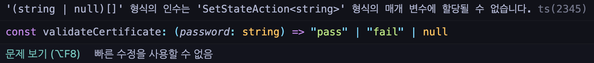 그런데 다음 코드에서 타입오류가 났다. 알고보니, useState에는 빈 문자열을 초기값으로 전달했는데 실상 배열을 설정해주고있으니, 타입에러가 났던 것이다.