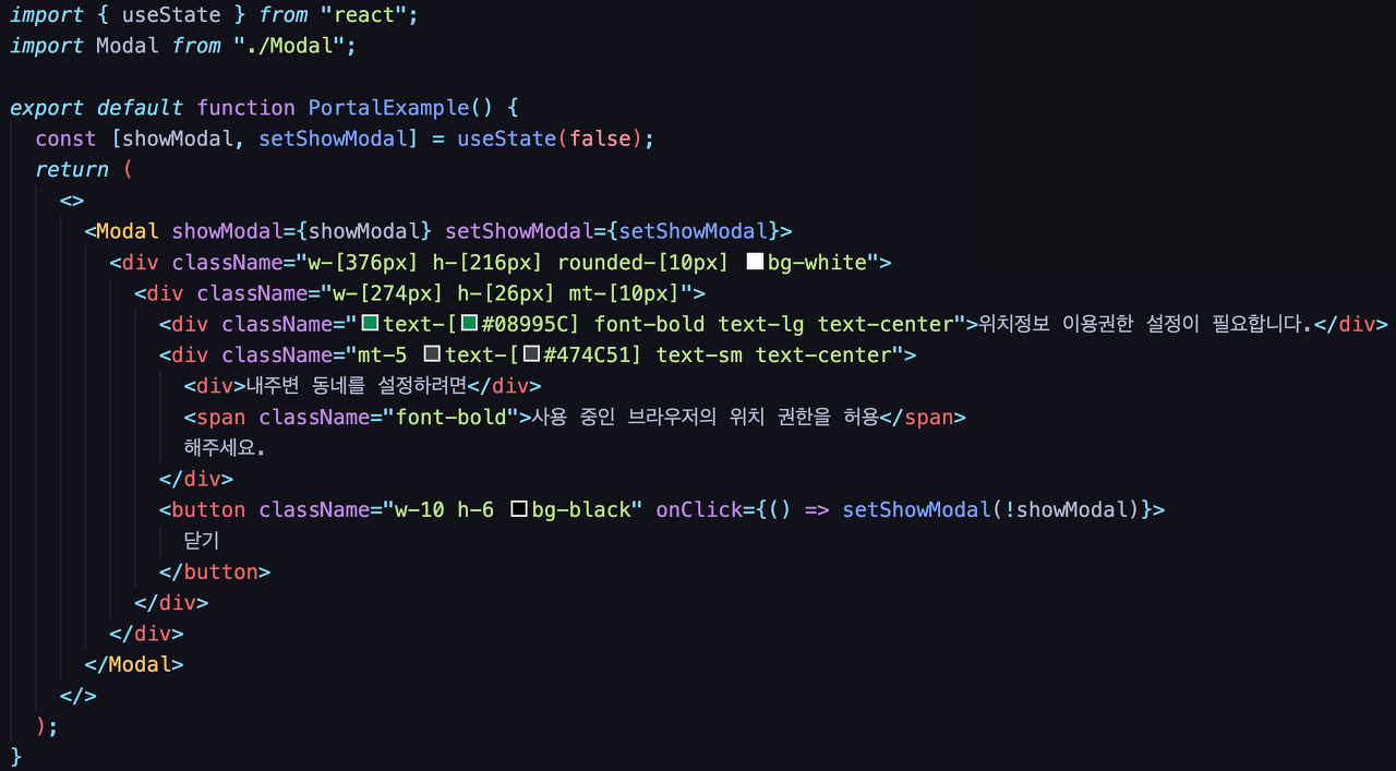 - 사용처에서 실질적으로 사용될 컴포넌트입니다. createPortal hook을 이용해 렌더링될 요소와, dom node를 지정합니다.