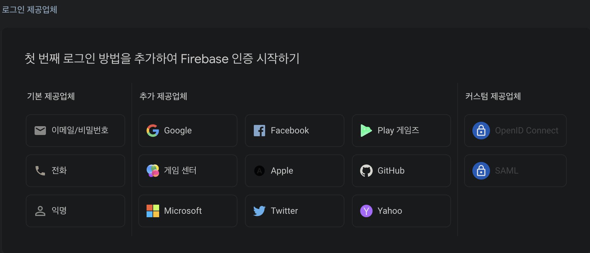 Firebase에서는 (storage, Hosting, cloud Messaging, Firestore)등 다양한 기능을 제공하지만, 그중 회원가입과 로그인을 구현가능케 해주는 기능은 ‘Firebase-Authentication’기능이다. 신기하게도, 다른 계정을 통해 로그인할 수 있는 툴도 제공해준다. (카카오는 없네)