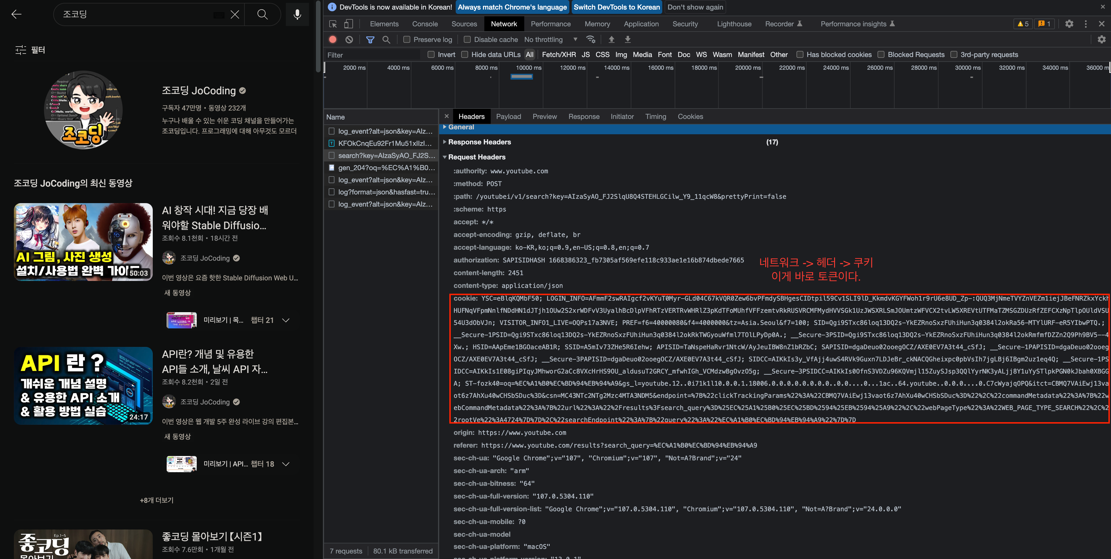(이때 토큰은 아래 사진과 같이 유저는 알아들을 수 없는 문자열로 구성되어 있다.)