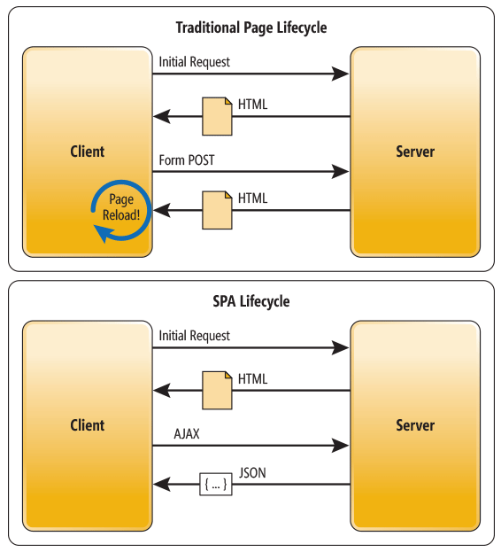 SPA는 위의 사진과 같이 처음 서버에서 한번만 HTML및 CSS파일과 JS파일을 받아온다.