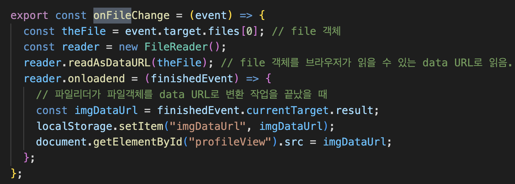 readAsDataURL이라는 reader의 method를 통해 the file을 인자로 넣으면 file객체가 DataUrl로 변환
